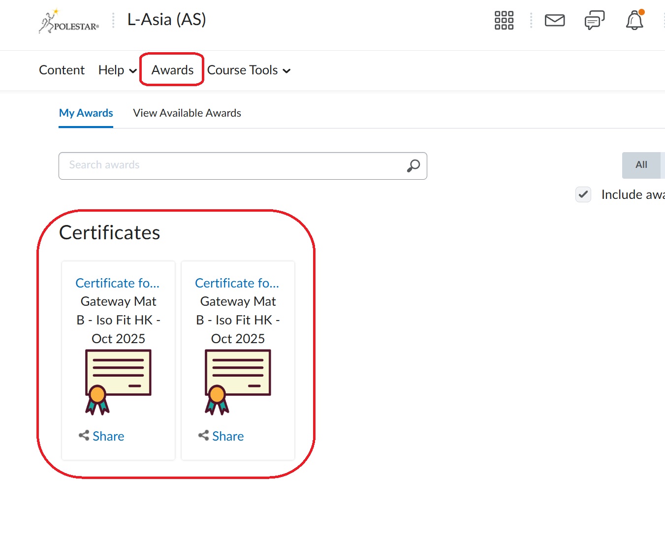 Account-Level Award History Even if individual course enrollments expire or you no longer have active access to specific courses, you can still view all your earned awards at the account level by using the "Include awards from other courses" option. Your complete achievement history remains accessible through your Polestar Online Platform account.